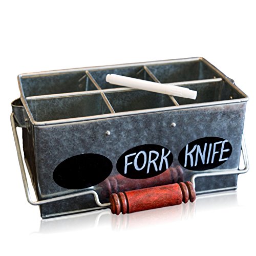 This shabby chic hammered tin flatware caddy with chalkboard labels and chalk pen organizes your tailgating table and saves space on your buffet table.