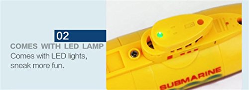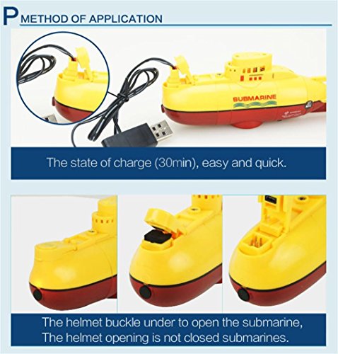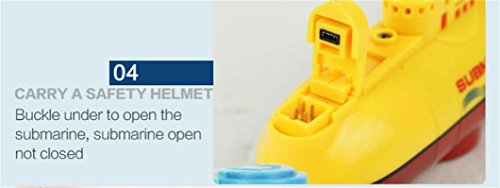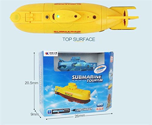 ▶ Specifications: ▶ Mode:Mode 2(Left hand throttle) ▶ Product size:15x6.8x4.5 cm ▶ Charging time:25-30 mins ▶ Discharging time:15-20 mins ▶ Dive depth: 0.5m ▶ Speed: 0.1m/s ▶ Battery for submarine: 3.7V 120mAh Li-po ▶ Battery for transmitter:6x 1.5V AAA (Not included) ▶ Certificate:EN71/EN62115/EMC/RTTE/RoHS/7P ▶ Function: Forward, Backward, turn left and right ▶ 27/40MHz radio control racing submarine ship for kids ▶ Suspending at a specific water depth ▶ 360°rotation at specific depths ▶ Straight line diving navigation ▶ With a remote waterproof transmitter ▶ Exercise your kid's mental ability and physical coordination ▶ Built-in rechargeable battery, USB charging cable included ▶ Packing include: ▶ 1 * Submarine ▶ 1*Transmitter ▶ 1*USB Cable ▶ 1*English Manual 0
