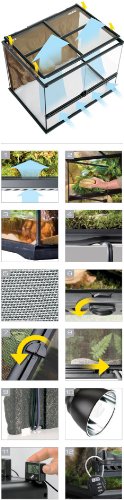 The full screen top allows UVB and infrared penetration, and is completely removable for easy access while decorating or cleaning. Durable locks at the sides secure the screen top to the terrarium frame. The top has built-in closable inlets on both sides to securely run wires and tubing inside the terrarium and keeps small reptiles and feeder insects inside the terrarium.