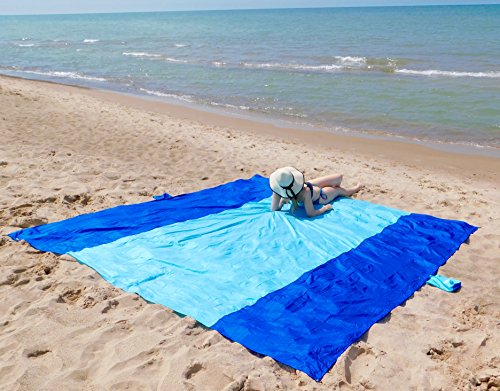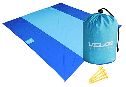 Studio : Veloz Sportz LLC Publisher : Veloz Sportz LLC Product Description Beach Blanket Sand Proof Oversized 9' x 10' ft. Color: blue/ sky blue. Compact size: 5" by 8" inches. Material:100% Parachute Nylon Ultra Soft Machine-washable and air-dries quickly. Weight: 1.60 Lbs. Multiple Uses: Outdoor indoor activities like picnic, hiking, camping. Product Features: 6 sand pockets plus 4 stakes and corner loops to ensure your blanket does not blow away on windy days! Have a worry free day! Attached compact bag and portable, easy to carry. Storage pocket for your valuables such as sunglasses, key, cell phone, etc.