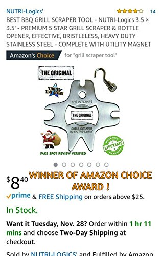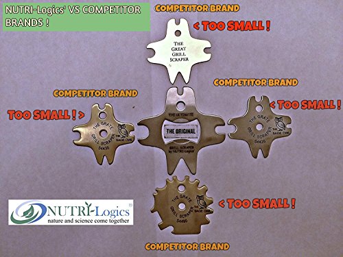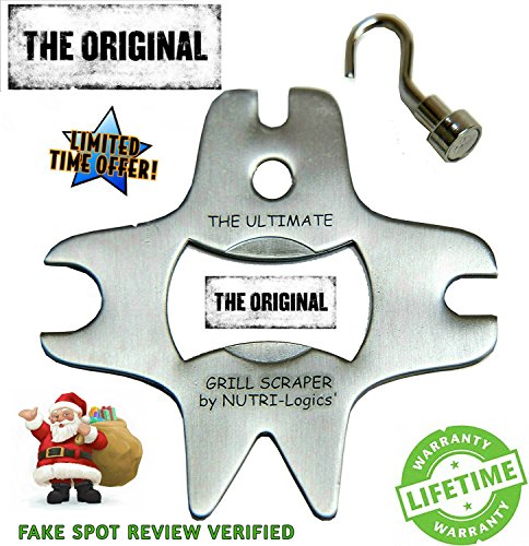 BEST BBQ GRILL SCRAPER TOOL - NUTRI-Logics 3.5 × 3.5' - PREMIUM 5 STAR GRILL SCRAPER & BOTTLE OPENER, EFFECTIVE, BRISTLELESS, HEAVY DUTY STAINLESS STEEL - COMPLETE WITH UTILITY MAGNET