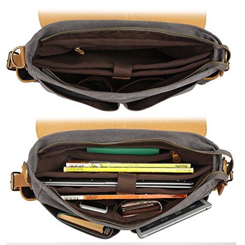 -. Feature : This trendy plambag is made of high density cotton canvas and PU faux leather, vintage antique brass hardware / Top zipper and front flap magnetic snap closure,the shoulder strap is adjustable & includes a shoulder pad which may release the stress for your shoulder when carrying laptop heavy / Exterior with 2 side pockets and 2 open pockets make quick access to cell phone & accessories a breeze, 1 back zip pocket for small objects / Inside,1 computer pocket with protection mat fits laptop, 2 open pockets and a wall zipper pocket / Dimensions:L16.54 * D4.72 * H11.81 inch.This messenger bag is nice and big. It's designed to easily carry for up to 16.5" laptop as well as all your daily essentials