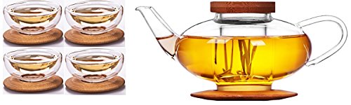 -. Brand : iRSE Tea -. Color : Glass -. EAN : 0766567953578 -. Feature : iRSE 25 oz clear glass teapot and 4 glass tea cups with glass infuser and bamboo lid and bamboo tray. / 4 x 3.5 oz Glass cups for tea shots and tea enjoyment. With 4 Bamboo tray for each cup. / This tea set is carefully hand crafted, made from heat resistant glass. Dishwasher top rack safe or hand clean. / Large infuser filter for loose teas or blooming teas. / Well-designed great looking teaset and infuser locks into place and ensures water doesn't leak out of your tea maker. -. Label : iRSE -. Manufacturer : iRSE -. PackageQuantity : 1 -. ProductGroup : Kitchen -. ProductTypeName : KITCHEN -. Publisher : iRSE -. Size : 24 oz, 700 ml -. Studio : iRSE -. Title : iRSE Glass Teaset 1 Teapot + 4 cups and Glass Infuser & Bamboo Lid & Bamboo Tray, Borosilicate Glass, durable heat resistant hot drink pot for loose leaf tea herbs herbal detox Dishwasher safe 24 oz -. UPC : 766567953578