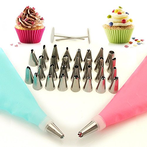 - Cake Decoration tips: 32 Icing Tips and 2 Silicone Pastry Bags, 2 Flower Nails, 2 Reusable Plastic Couplers, and you can create all types of patterns on cake, cupcakes, donuts, pastries, cookies and so much more.