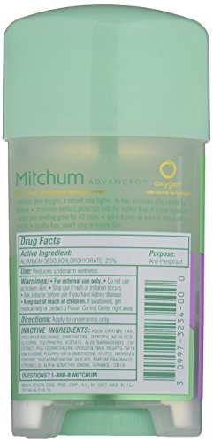 -. Binding : Health and Beauty -. Brand : Mitchum -. Feature : Quick-drying gel formula leaves no trace of messy white residue on you or your clothes. / Clinically proven to provide effective wetness protection all day long / - -. Label : Mitchum -. Manufacturer : Mitchum -. MPN : 3234-00 -. PartNumber : 3234-00 -. ProductGroup : Health and Beauty -. ProductTypeName : HEALTH_PERSONAL_CARE -. Publisher : Mitchum -. Studio : Mitchum -. Title : Mitchum Women Advanced Oxygen 48 hour protection Shower fresh, 2.25 oz (63 g) (Pack of 6)