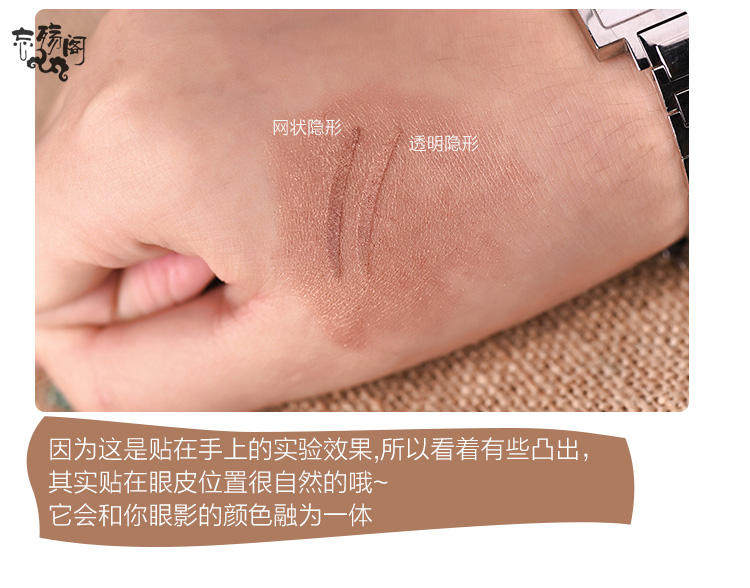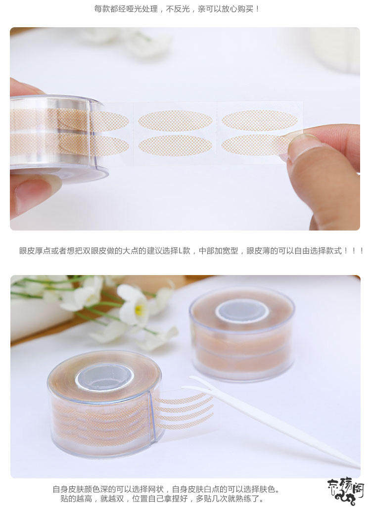 这个神物真的太招人喜欢了,网状双眼皮贴仿皮肤纹理的原理,贴上之后绝对比传统的双眼皮贴隐形,如果画上眼影会更隐形。