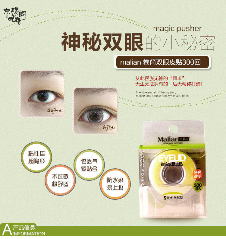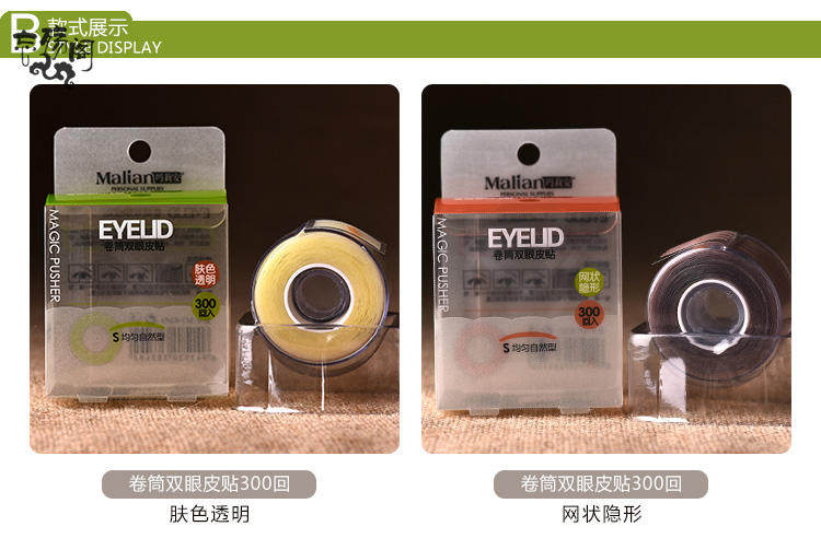 使用方法:轻轻拉出双眼皮贴至适当位置,用指腹压住其中一端,轻轻一撕,然后用铲子取出双眼皮贴贴于眼皮适当位置。