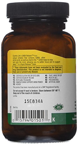 -. Binding : Health and Beauty -. Brand : Country Life -. EAN : 0015794015017 -. Feature : Aids in the utilization of amino acids / Special vegetable cellulose Rapid Release base / Vegetarian; kosher product -. IsAutographed : 0 -. IsMemorabilia : 0 -. Label : Country Life -. Manufacturer : Country Life -. Model : 015794015017 -. MPN : 015794015017 -. NumberOfItems : 1 -. PackageQuantity : 1 -. PartNumber : 015794015017 -. ProductGroup : Health and Beauty -. ProductTypeName : HEALTH_PERSONAL_CARE -. PublicationDate : 2010-08-02 -. Publisher : Country Life -. Size : 60 -. Studio : Country Life -. Title : Country Life Gaba Relaxer, 60-Count -. UPC : 015794015017