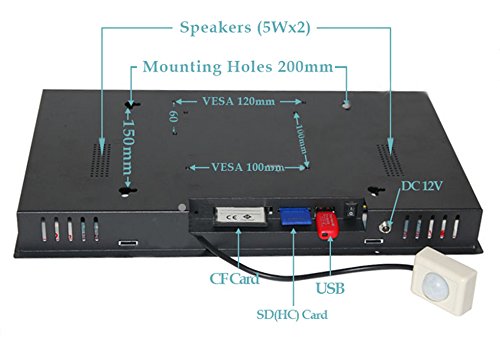 -. Feature : 15.6″LCD screen with Motion Sensor; Strong Metal Frame; Works with SD card or USB 2.0; Comes with remote control / Supports 15 kinds of photo switching modes, rolling caption, real 1080P HD decode, and multi language OSD / Super time switch function, can auto turn on/off at a specific time / AC Power Input: AC: 100~240 V 50/60Hz; DC Power Output: 12V / 3A / Photo: JPEG, BMP; Video: MP4, AVI, DIVX, XVID, VOB, DAT, MPG, MPEG, RM, RMVB, MKV, MOV, HDMOV, M4V, PMP, AVC, FLV, H.264
