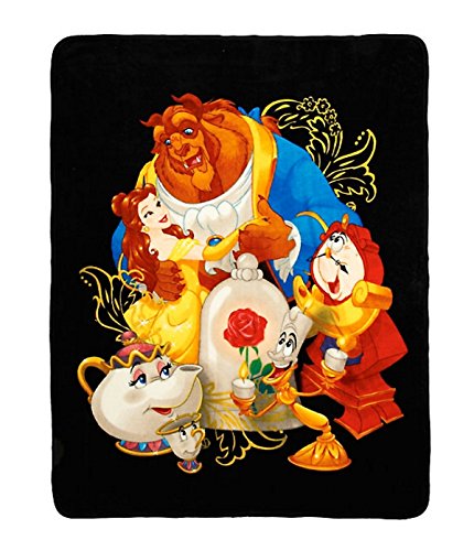 Super soft plush throw from Disney's Beauty and the Beast with a colorful characters design featuring Beast, Belle, Mrs. Potts, Chip, Lumiere & Cogsworth surrounding the Enchanted Rose. 48" x 60" 100% polyester, Wash cold; dry low, imported