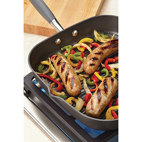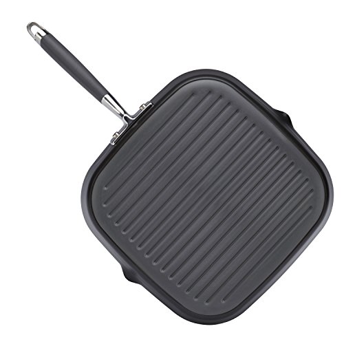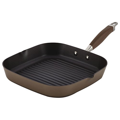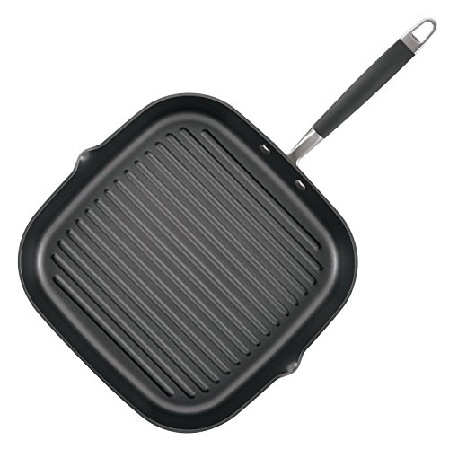 Bring juicy, grilled flavors into the comfort of the kitchen with the Anolon Advanced Hard-Anodized Nonstick 11-Inch Deep Square Grill Pan with Pour Spouts. This square grill pan features heavy-duty, hard-anodized construction for even heat distribution and exceptional cooking performance and boasts ridges on the interior cooking surface to create attractive grilling marks on free-range chicken breasts and more. A channel around the pan sides collects and holds rendered fats and other unwanted liquids away from food and the pair of corner spouts allow easy pour off when the cooking is done. PFOA-free restaurant-tested DuPont Autograph 2 nonstick surface inside and out is metal utensil safe and stands up to the rigors of a professional kitchen. Best of all, cleanup is effortless. The grill pan's revolutionary rubberized stainless steel Anolon SureGrip handle provides a confident yet soft grasp when turning juicy, grass-fed burgers. The comfortable handle is also dual riveted for extra strength and oven safe to 400 Degree F. Along with the rest of the Anolon Advanced Cookware line, this grill pan works well with saucepots, cookware sets and other items in the Anolon Advanced collection.Feature