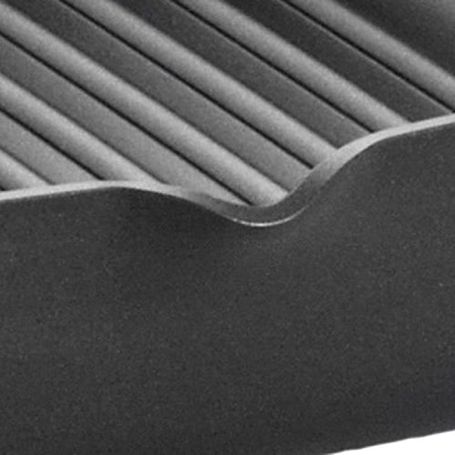 The pan has heavy-duty, hard-anodized construction for quick even heating and ridges that create grill marks and allow fats to drip away from food