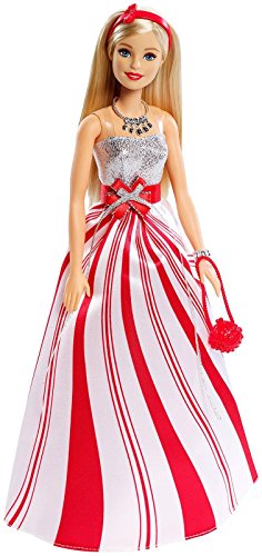 -. Feature : Barbie doll wears a candy cane-themed gown to celebrate the holidays! / The gown is sweet with a glittery silvery bodice, a long shimmery skirt with candy cane P.R.Int and a gift-inspired bow at the waist / Festive accessories include a silvery necklace and bangle, a red headband with bow, matching shoes and red ornament-themed purse / With a new gown every year, this doll is perfect for adding to or starting a holiday tradition / Celebrate the season or give the gift of Barbie with this gorgeous holiday doll