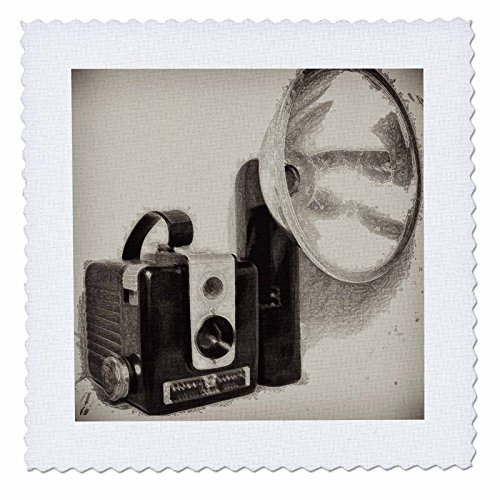 Picture of a Vintage 1950s camera with bulb flash Quilt Square is a great way to create, showcase and remember a meaningful moment. Overall size is 10" x 10" with 7.5" x 7.5" image. Made of 100% cotton that will not fade with washing.Feature