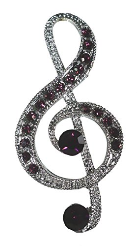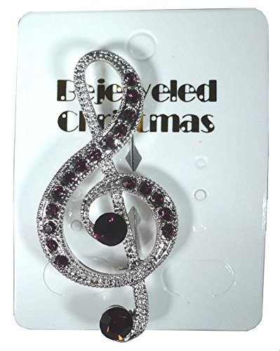 -. Binding : Jewelry -. Brand : Bejeweled Christmas -. Color : Purple -. Department : womens -. Feature : Pin back with safety C clasp. / About 2 1/4 inches long top to bottom, 1 inch wide / Made in China / Silvertone and purple Austrian metal-backed rhinestones / Pin is neatly wrapped in pretty tissue and includes gift box -. Label : Bejeweled Christmas -. Manufacturer : Bejeweled Christmas -. Model : 142 -. MPN : 142 -. PartNumber : 142 -. ProductGroup : Jewelry -. ProductTypeName : FASHIONOTHER -. Publisher : Bejeweled Christmas -. Studio : Bejeweled Christmas -. Title : Bejeweled Christmas Silvertone Purple Treble Clef Music Pin 142