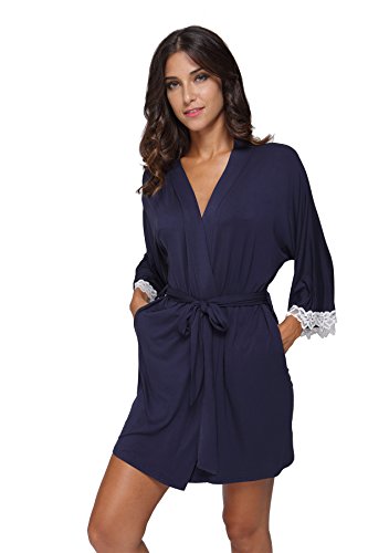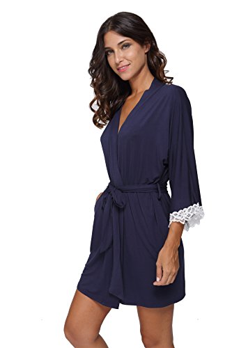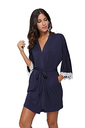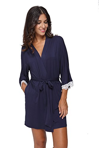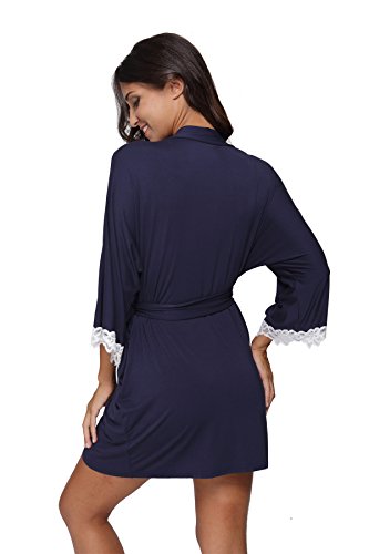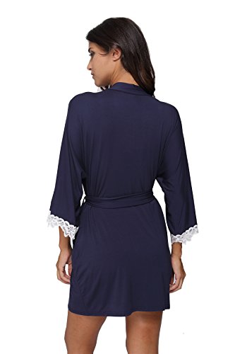 The Bund Women's Short Sleepwear Modal Cotton Knit Robe-Lace Trim, L Dark Blue