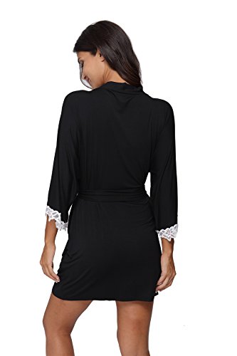 The Bund Women's Short Sleepwear Modal Cotton Knit Robe-Lace Trim, L Black
