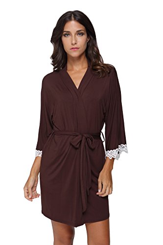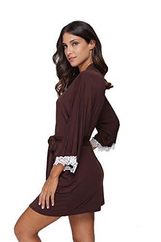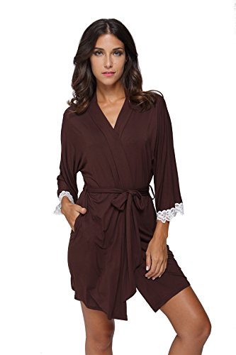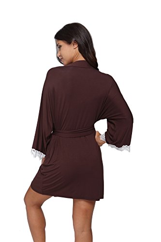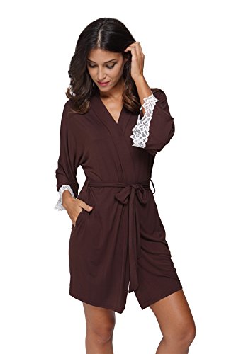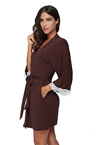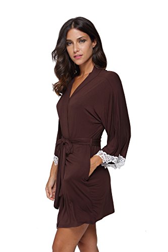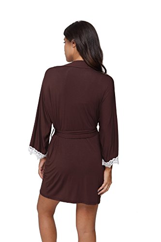 The Bund Women's Short Sleepwear Modal Cotton Knit Robe-Lace Trim, L Brown