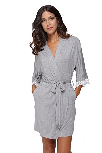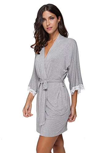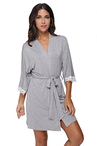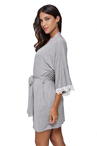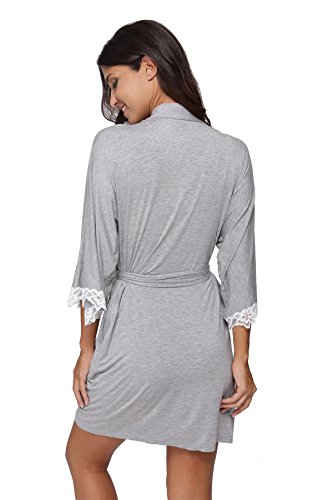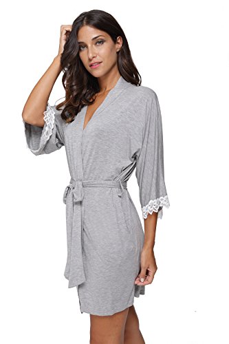The Bund Women's Short Sleepwear Modal Cotton Knit Robe-Lace Trim, L Grey