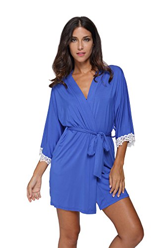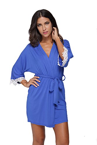 The Bund Women's Short Sleepwear Modal Cotton Knit Robe-Lace Trim, L Royal Blue