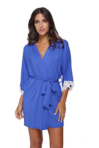 The Bund Women's Short Sleepwear Modal Cotton Knit Robe-Lace Trim, S Royal Blue