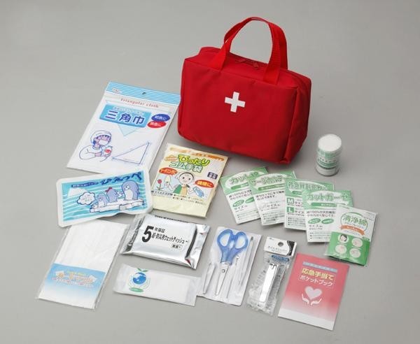 | セット内容 | 救急バッグ(230×100×155mm)、カット綿×3枚、カットガーゼ×3枚、包帯、救急絆創膏2サイズ×3枚、サージカルテープ、清浄綿2枚入×3包、ハサミ、ピンセット、毛抜き、耳かき、冷却パック、ゴム手袋(2双入)、ECO便利バッグ、ウェットティッシュ20枚、爪切り、三角巾、マスク(2枚入)、応急手当てポケットブック |