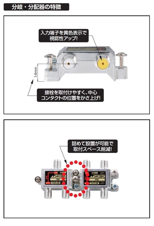 | 仕様 | 屋内用・1分岐器 地上・BS・110度CS デジタル放送 CS(3224MHz)・BS・UHF・VHF・FM・CATV(10~770MHz) RoHS対応 入力端子-出力端子間:最大DC15V・0.8A/AC30V・1A 使用温度範囲:-10~+40 ●周波数帯域10~76MHz 挿入損失:1.5dB以下 結合損失:11.5dB以下 逆結合損失:18dB以上 電圧定在波比(VSWR):2.2以下 ●周波数帯域76~222MHz 挿入損失:1.5dB以下 結合損失:11.5dB以下 逆結合損失:25dB以上 電圧定在波比(VSWR):1.8以下 ●周波数帯域222~770MHz 挿入損失:2.0dB以下 結合損失:12.0dB以下 逆結合損失:20dB以上 電圧定在波比(VSWR):1.8以下 ●周波数帯域770~1489MHz 挿入損失:2.5dB以下 結合損失:12.5dB以下 逆結合損失:18dB以上 電圧定在波比(VSWR):2.0以下 ●周波数帯域1489~2150MHz 挿入損失:3.0dB以下 結合損失:13.5dB以下 逆結合損失:17dB以上 電圧定在波比(VSWR):2.0以下 ●周波数帯域2150~2681MHz 挿入損失:3.5dB以下 結合損失:14.5dB以下 逆結合損失:16dB以上 電圧定在波比(VSWR):2.0以下 ●周波数帯域2681~3224MHz 挿入損失:4.3dB以下 結合損失:15.8dB以下 逆結合損失:16dB以上 電圧定在波比(VSWR):2.5以下 |