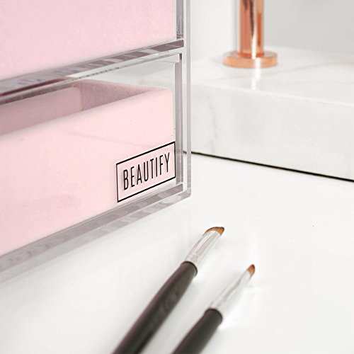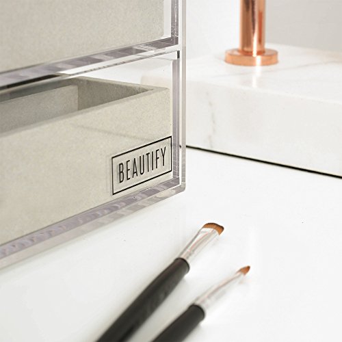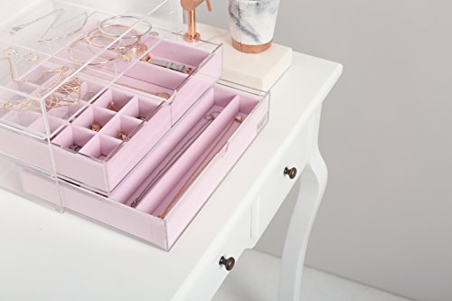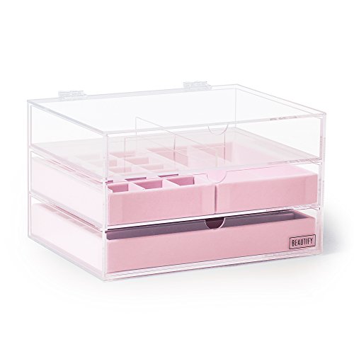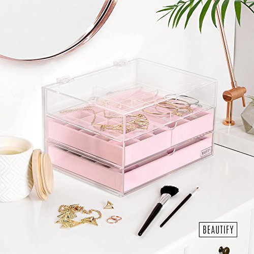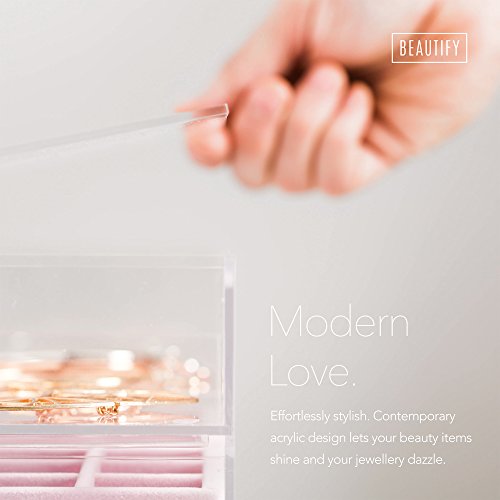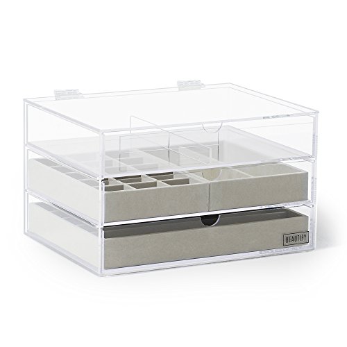 -. Title : Beautify Acrylic Jewelry & Cosmetic Organizer Box with 3 Storage Trays & Gray Suede Dividers - Clear