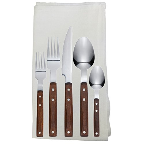 IKEA RUSTIK Wooden Handle Stainless Steel Flatware Tableware Set - 20 Piece Place Setting Silverware - Includes Fork Knife Spoon Teaspoon Dessert / Salad Fork + 100% Cotton Napkins - Service for 4