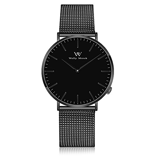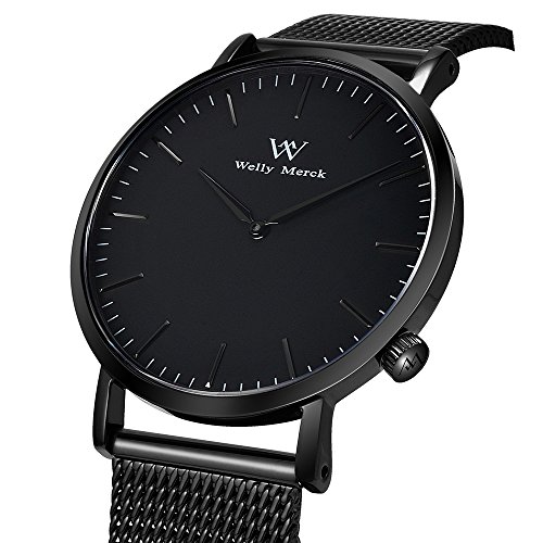 -. Title : Welly Merck Men's Luxury Watch Minimalist Ultra Thin Slim Quartz Movement Sapphire Crystal Analog Wrist Watch Black Stainless Steel 20mm Width Mesh Interchangeable Strap 5ATM Water Resistant