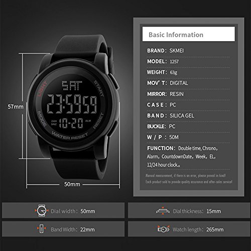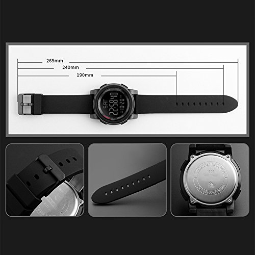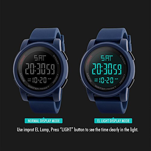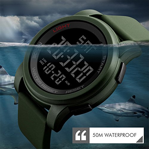 -. Feature : Daily Alarm and Two Time Zones / LED back light functions make it perfect for all kind of sport and daily use / Countdown Timer: It can count down from a preset time to zero, when zero is reached it will chime / 50M waterresistant for daily use: Perfect for all kind of business, protect watch from Raining, Splashing, Sweating, Swimming and Bath, but avoid hot steam and Don't Press any botton under the water / SIMPLE and FASHION: Sport fashion design with simplicity, perfect for both indoor and outdoor activities