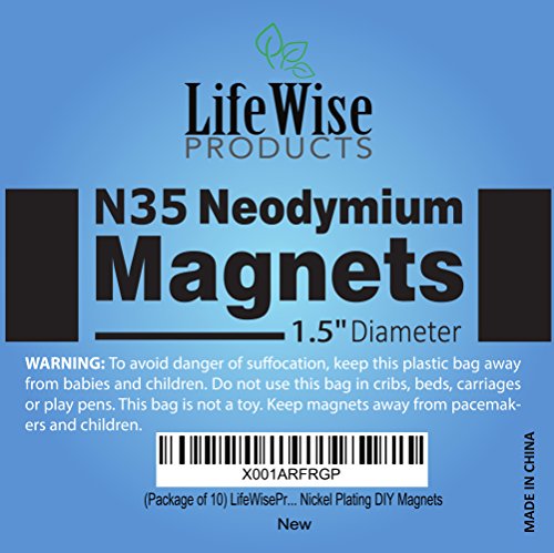 (Package of 10) LifeWiseProducts N35 Neodymium Disc Magnets - 1.5" (38mm) Diameter x 0.25" (6.4mm) Height - 20 lbs+ Pounds Pulling Force NdFeB Rare Earth Magnets Coated Nickel Plating DIY Magnets
