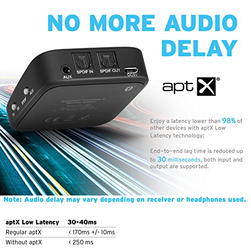 INSTANT SOUND: Enjoy a latency lower than 98% of other devices with aptX Low Latency technology; end-to-end lag time is reduced up to 30 milliseconds, both input and output are supported, so you can watch TV / Movie / Video and listen to high-clarity sound in perfect synchronization
