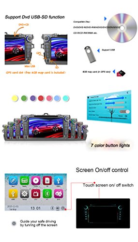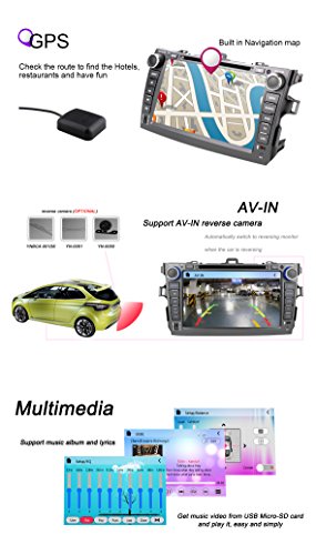 - Feature : The plug and play in-dash vehicle gps units fit to TOYOTA COROLLA 2007-2011 without JBL, if your car has JBL, then please buy a Can Bus Decoder B011ARL1NG / Double 2 Din in Dash car DVD GPS player with 8 inch 800*480 WVGA resistive touchscreen, anti-glare, day night readable; Loaded with Win CE 6.0, ARM11 processor core 800MHz CPU, DDR3 256MB RAM / Compatible with top GPS software, built-in GPS navigation; Bulit-in bluetooth for hands-free calling and phone music playing; Support AV-IN reverse camera, DVR Digital Video Recorder, Steeing Wheel Control; Support 3G WCDMA Internet / Support iPod/iPhone audio input; 30 stations of analog AM/FM RDS radio; Support music or video playback via SD/USB/DVD/CD/AUX-IN; Features VMCD to record 6 disc tracks into one USB drive; Support DTV ATSC TV Tuner; Support subwoofer and EQ, 4*50W power output / Free external and Free map in a Free 8GB map card; 12 months warranty for quality-related issues;