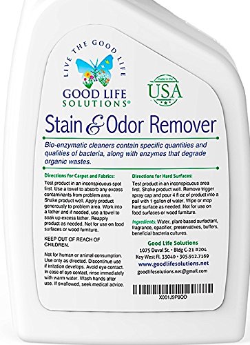 -. Feature : LOOKING FOR A SAFER, NATURAL, EARTH-FRIENDLY ANSWER TO THOSE INEVITABLE STAINS THAT HAPPEN WHEN YOU LIVE WITH KIDS AND PETS? Good Life Solutions has formulated a superior product that actually eats away organic stains and the odors that go along with them. This is not harsh chemicals and eye watering fragrance but a Bio-Enzymatic Solution with a gentle scent that actually works. / ARE YOU READY FOR A STAIN AND ODOR REMOVER THAT IS RELENTLESS AND RELIABLE? This bio-enzymatic formula removes stains and odors from POOP, PEE, SLOBBER, VOMIT, BLOOD, SWEAT, DROOL, JUICE, FOOD, OR WHATEVER COMBINATION OF GROSS ORGANIC WASTE YOUR FAMILY COMES UP WITH. / HAVE YOU BEEN WAITING FOR A VERSATILE STAIN AND ODOR REMOVING PRODUCT YOU WILL RELY ON MORE THAN ANY OTHER CLEANING PRODUCT IN YOUR ARSENAL? THINK: carpet, upholstery, fabric, tile, water-safe hard flooring, concrete, pet beds, pet crates, pack and play mattresses, baby crib pads, infant and child car seats, automobiles, RVs, boats, yoga mats, athletic gear, diaper changing tables, diaper caddies, machine washable laundry and so much more. / •HAD ENOUGH OF SMEARING AROUND CHEMICALS AND FRAGRANCES THAT ONLY MASK THE SOURCE OF THE PROBLEM? Unlike other standard chemical cleaners, our formula utilizes a plant-based surfactant that devours the substance that made the stain and takes the odor with it. / •TIRED OF USING A CLEANING PRODUCT THAT LEAVES YOUR HOUSE SMELLING LIKE FAKE FLOWERS OR A HYPER-SANITIZED HOSPITAL RESTROOM? Good Life Solutions has created a whole new opportunity for you to defeat the stains and odors associated with daily life, and leaves behind a subtle hint of just plain clean.