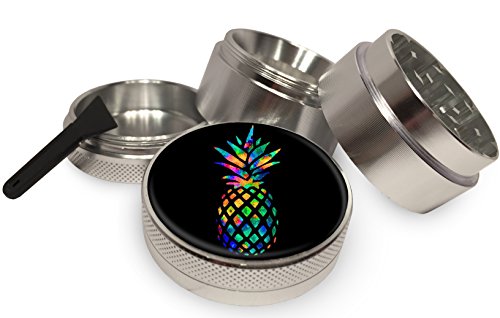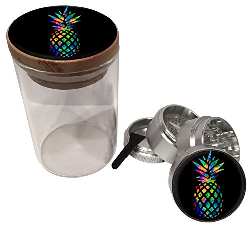 Silver Grinder and Wood Pop off Top Jar Premium Combo pack - 4 Piece Aerospace Aluminum Metal Grinder 1.5" w/ Glass with air tight seal 3.5" Tall - Grind & Store Herbs and Spices! (Rainbow Pineapple)