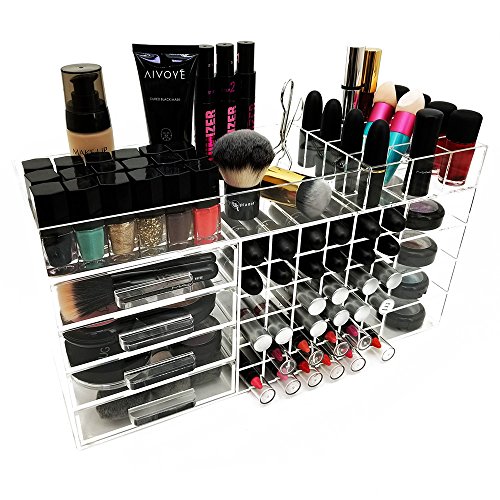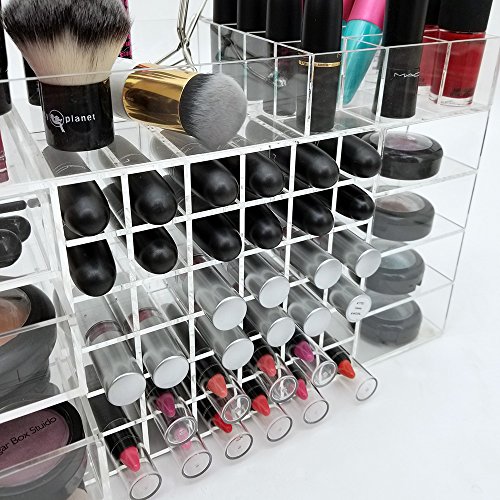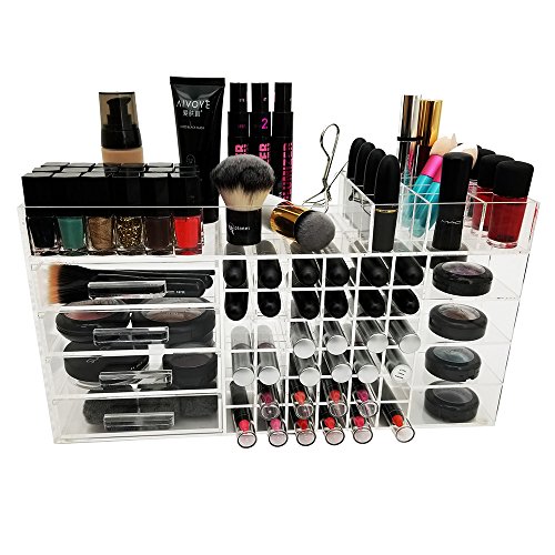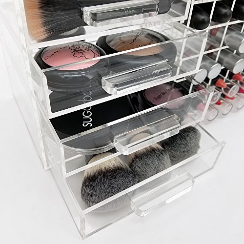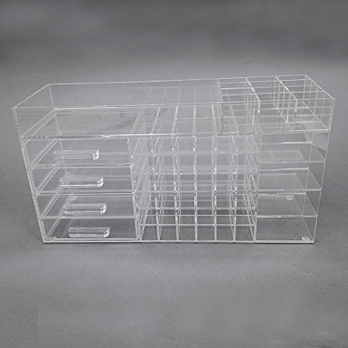 Studio : OnDisplay Publisher : OnDisplay Product Description Need a fantastic way to store all your makeup? Do you find it impossible to find that lipstick or mascara in your drawers stuffed with piles of cosmetics? Our new Samantha Deluxe Handmade Cosmetic Organizer neatly stores all your makeup in one simple and awesome design! Constructed of premium crystal clear acrylic, the Samantha Cosmetic Organizer features 4 pull out drawers each measuring 5.5" wide and 5" deep. The top tier has a large open tray measuring 10.25" x 5" for storing larger items such as bottles, sprays and other accessories. It also features a dozen 1.5" x 1.25" sections perfect for nail polishes, glosses and lipsticks. If that isn't enough for you, the front panel offer 36 lipstick slots measuring 1" x 1" x 2.5". Still not enough? Turn the unit around and you will have another 36 lipstick slots. On the right side, we added 8 sections measuring 2.5" wide by 1.5" tall and 3.25" deep perfect for storing your small compacts, bronzers, eye shadows and other cosmetics. The entire unit measures 15.5" wide x 5.25" deep x 8.25" tall. The ultimate showcase for the cosmetic diva in you. 0