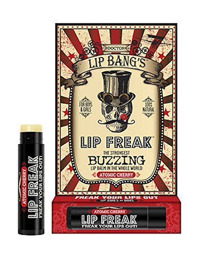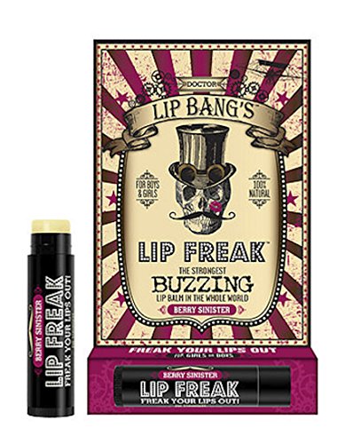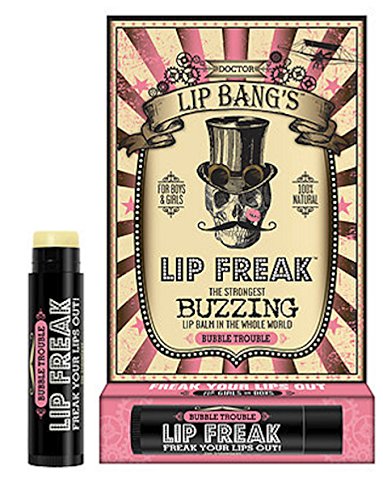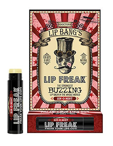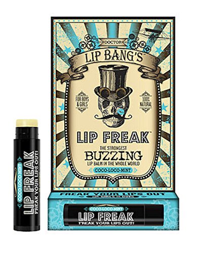 Doctor Lip Bang's Lip Freak. The Strongest Buzzing Lip Balm in the Whole World. Just pucker up and smear this awesome balm on your kisser. Within a few minutes, your lips are going to FREAK OUT. We're talking about a crazy vibrating buzz that's unlike anything you've ever felt before. Doctor Lip Bang's products are 100% Natural and contain no harsh preservatives or synthesized ingredients. Our lip balms are made from the highest-grade plant-based extracts and premium beeswax available, and we never, ever test on animals. We use only the best and healthiest ingredients because we believe that what you put in and on your body should be GOOD FOR YOU! LIP FREAK CONTAINS THE FOLLOWING INGREDIENTS: Beeswax, Prunus Amygdalus Dulcis (Sweet Almond Oil), Citrus Sinensis (Sweet Orange) Essential Oil, Zingiber Officinale (Ginger), Cinnamomum Zeylanicum (Cinnamon Oil), Natural Tocopherols (Vitamin E), Rosmarinus Officinalis (Rosemary Oil Extract), Zanthoxylum Americanum, Stevia Rebadiana Leaf Extract, Natural Flavors COCO-LOCO-MINT & SIN INGREDIENTS: Beeswax, Prunus Amygdalus Dulcis (Sweet Almond Oil), Citrus Sinensis (Sweet Orange) Essential Oil, Zingiber Officinale (Ginger), Cinnamomum Zeylanicum (Cinnamon Oil), Natural Tocopherols (Vitamin E), Rosmarinus Officinalis (Rosemary Oil Extract), Zanthoxylum Americanum, Stevia Rebadiana Leaf Extract, Natural Flavors okay, okay, lip freak is full of healthy ingredients that are good for me... (we sense a "but" coming next) BUT WHY THE HECK DOES IT BUZZ? Does the buzzing help carry all the moisturizing ingredients into my kisser? Is the vibrating sensation somehow helping heal my lips? Is this lip balm infused with magic that will give me superpowers? These are all valid (and totally real) questions we've been asked about the signature BUZZ Lip Freak delivers... So WHY did we make a lip balm that buzzes? Because healthy products should be fun. That's right. FUN.Feature