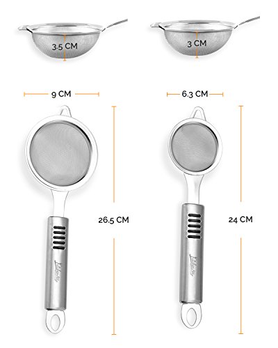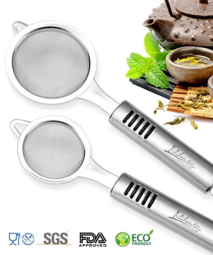 Stainless steel extra fine mesh strainer makes it possible to strain liquids and sift dry ingredients like Quinoa, Chia Seeds, Flax, Sesame Seeds, Loose- Leaf Tea, Coffee, Mint Leaves, Sauces Jams, Yogurt, Fruit Smoothies, Baking Ingredients and much more. These strainers have solid, thick, stainless steel rims around them with the mesh edges fully enclosed within to prevent wire from sticking out and keeps particles from getting trapped.