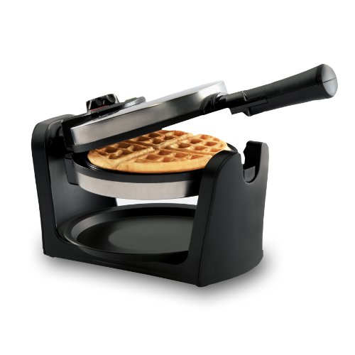 -. Feature : Professional quality rotates for easy baking and browning / Makes 1 in thick 7-inch round waffles with 4 easy cut sections / Non stick coated plates with drip tray / Adjustable controls for light to dark browning / Power and ready indicator lights with easy fold away storage