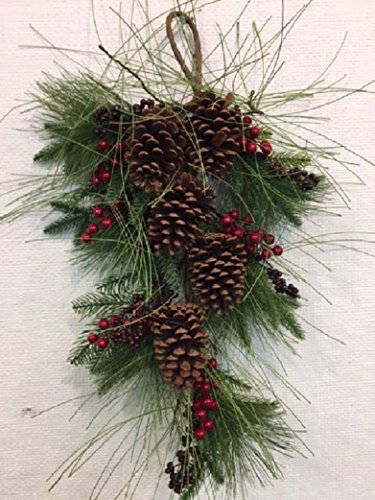 Country Winter Greens Swag Tear Drop With Large Pine Cones and Red Berries Decorative Front Door Winter Wreath Teardrop Indoor Holiday Christmas Home Decor