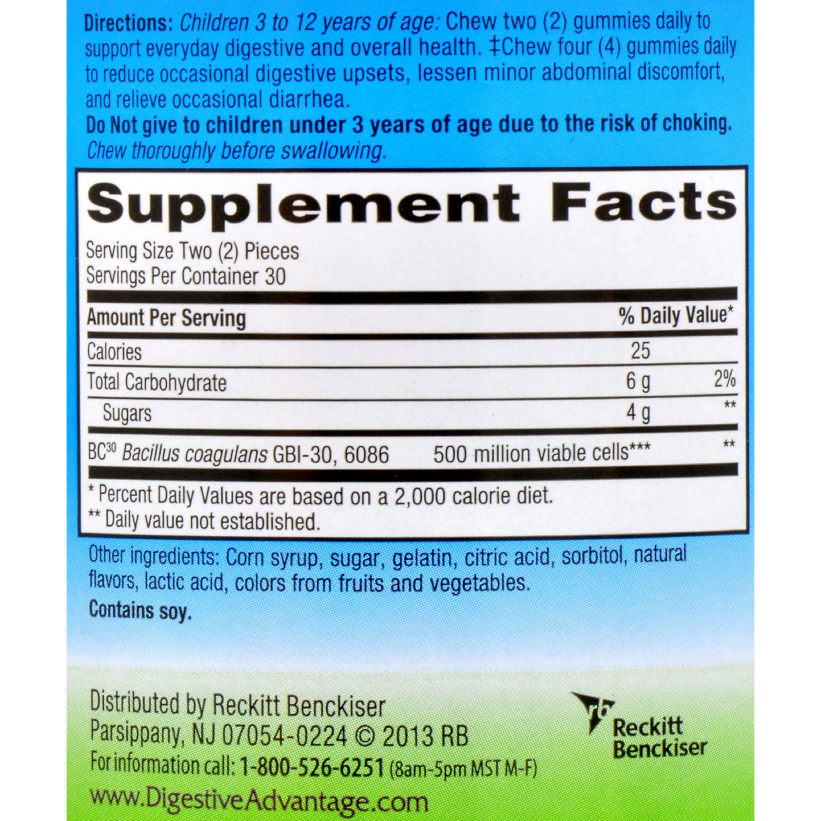 | New! Help support your child's everyday digestive and overall health with great-tasting gummies that your kids will love!* Good for: Digestive Helps reduce occasional digestive upsets * Lessens minor abdominal discomfort and bloating * Helps relieve occasional diarrhea Powered by Ganeden BC30 Probiotic - survives 10X better than yogurt and other probiotics * Natural fruit flavors + Based on median % survivability of Digestive Advantage vs. probiotic supplements and 20 probiotic yogurts in simulated gastric pH for 2 hours. * THESE STATEMENTS HAVE NOT BEEN EVALUATED BY THE FOOD AND DRUG ADMINISTRATION. THESE PRODUCTS ARE NOT INTENDED TO DIAGNOSE, TREAT, CURE OR PREVENT DISEASE. Ingredients : Serving Size: Two (2) Pieces Servings per Container: 30 Amount Per Serving % Daily Value Calories 25 Total Carbohydrate 6 g 2% Sugars 4 g * BC30 Bacillus coagulans GBI-30, 6086 500 million viable cells** * * Daily Value not established. ** At time of manufacture. Percent Daily Values are based on a 2,000 calorie diet. Other Ingredients: Corn syrup, sugar, gelatin, citric acid, sorbitol, natural flavors, lactic acid, colors from fruits and vegetables. Contains soy. NOTE: If pregnant, lactating or on prescribed medication, consult your physician before using. Excessive consumption may have a laxative effect in children. Always consult your pediatrician before giving your child dietary supplements. Country of origin : USA Size : 60 CT Pack of : 1 Product Selling Unit : each |