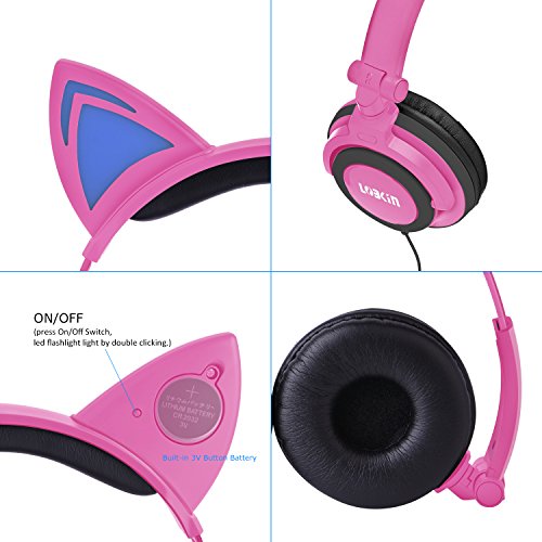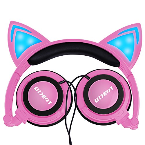 LOBKIN Foldable Wired Over Ear Kids Headphone with Glowing Light for Girls Children Cosplay Fans,Cat Ear Headphones (pink)
