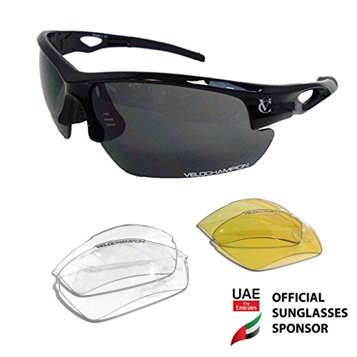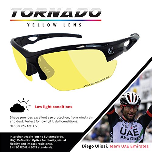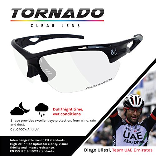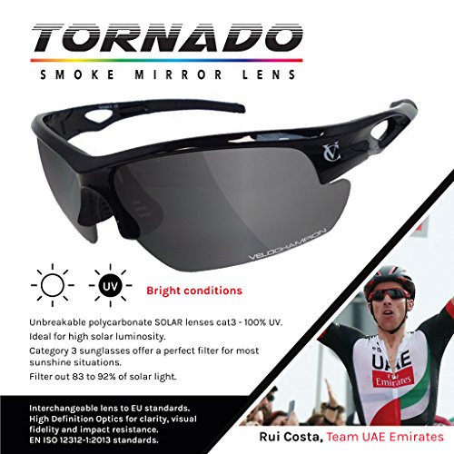 VeloChampion are the official eyewear supplier to the World Tour Team UAE Emirates. Velochampion Tornado Cycling / Running sunglasses – with spare lens for different lighting conditions 100% UV eye protection plus wind and glare protection during outdoor sports like cycling running trekking hiking skiing shooting fishing and driving