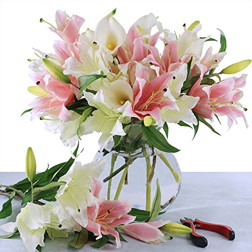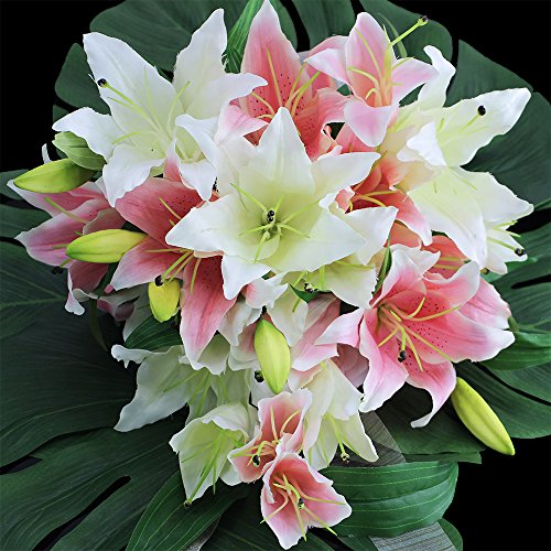 There are 2 fully open lilies and each flower is approx. 4.7” wide while the entire spray including the leaves is approx. 13” wide. The gorgeous pink silk petals feel amazingly realistic and just like live lilies, the center has tiny freckles (a kiss from nature)! To enhance the natural look, there are 2 lily buds and one is just starting to open while the other is still closed. Just like a real lily, these buds have a light yellow-green hue.