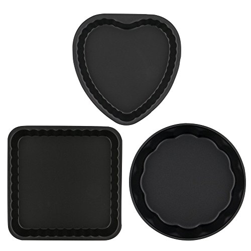 - Includes 9.75" heart, 10.25" round, and 9.5" square scalloped cake pans