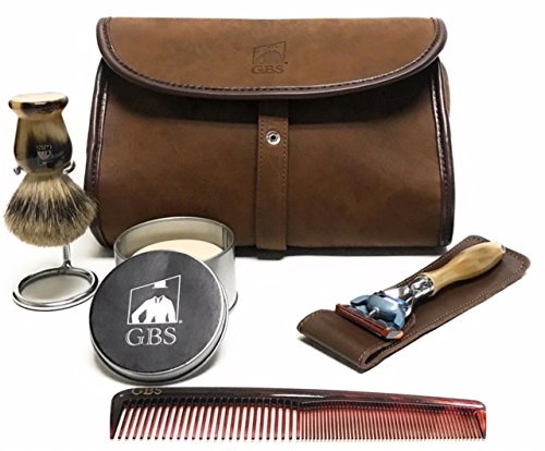 Men's Deluxe Travel Doppler Grooming Shaving Set - Horn Edition - Pure Badger Shaving Brush, Stand, Fusion Razor with Case, Travel Soap + Leather Brown...