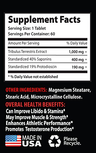 Studio : Sport Supplements, LLC Publisher : Sport Supplements, LLC Binding : Health and Beauty Product Description Testosterone sexual booster - TRIBULUS TERRESTRIS EXTRACT 1000MG - MUSCLE STRENGTH - Tribulus vitamin - 3 Bottles 180 Tablets TRIBULUS TERRESTRIS EXTRACT TESTOSTERONE: As a dietary supplement, Tribulus Terrestris extract has been shown in some studies it can be beneficial for increasing levels of testosterone and to increasing sex drive and performance in male. TRIBULUS TERRESTRIS EXTRACT MUSCLE: Tribulus terrestris increases testosterone levels, which helps to increase muscle mass. According to the Physicians Select website, studies reveal an increase in testosterone levels when tribulus terrestris is taken. TRIBULUS STRENGTH TESTOSTERONE BOOSTER: Because of its impact on testosterone levels, Tribulus Terrestris is very effective for improving endurance and building muscle. It helps prevent fatigue and boost energy levels TRIBULUS SEXUAL VITALITY: One of the main properties of tribulus which has widely been accepted by both traditional and Western medicine is those associated with providing a natural boost to the libido. Indian and Chinese medicine have both traditionally used this herbal extract to boost sexual health. TRIBULUS TERRESTRIS BODYBUILDING: Tribulus Terrestris extract also can be helpful to maintain a healthy weight. This use is especially common among bodybuilders and other athletes with high rates of calorie expenditure 0