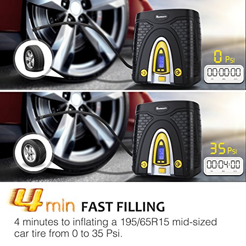 FAST INFLATION: only 4 mins to quickly inflate a standard P195/65R15 car tire from 0 to 35psi and 1 min to fill it from 28 to 35psi