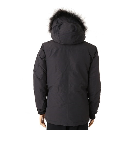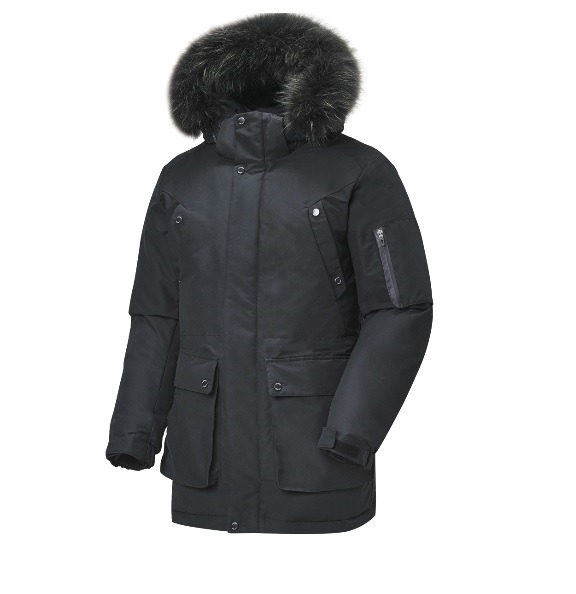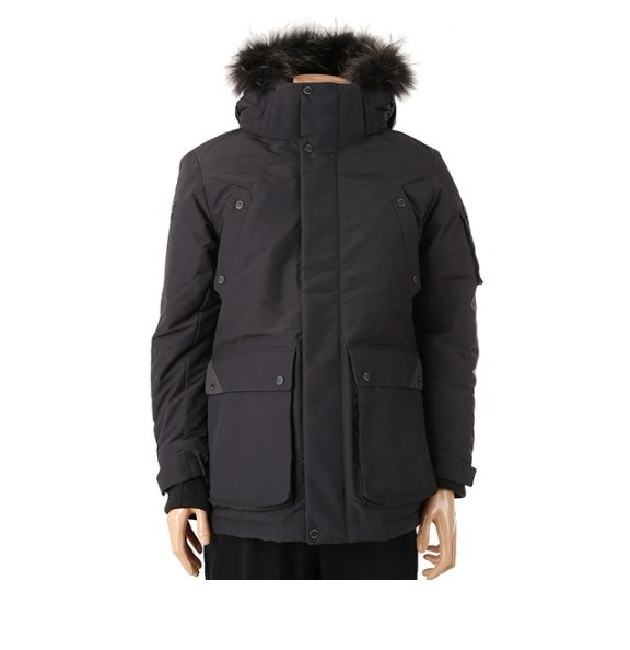 남성용 야상 사파리 덕 다운 자켓면터치 느낌의 원단을 사용하여 원단 내구성을 높인 제품후드 탈부착이 가능하며 천연 라쿤털로 고급스러움을 더함